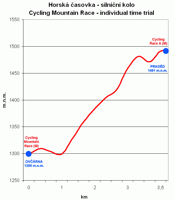 Konání závodu umožnil podnik Lesy České republiky, s.p. Pořadatelé i závodníci děkují za tuto podporu. Hlavní stránka eXtrememan Jeseniky - M ČR jednotlivců - JESENICKÝ TVRĎÁK 2017 DISCIPLÍNY:1. disciplína - noční orientační běh Délka 2-3km. Start individuální po výkladu tratí v pátek cca 22.30 - 23.00. hod. Závodníci obrží mapu pro noční OB. Závodníci musí použít vlastní čelové svítilny. Jedná se o zařazení disciplíny, která tvoří základ Adventure Race nebo survivalu. Pořadí disciplíny noční OB určí pořadí startu běhu (M) a canyoningu (D), kdy především canyoning je vymezen vstupem šířky pro jednoho závodníka. Motivační kritérium pro závod v Nočním OB: Prvni 1/3 závodníků má -1 trestný okruh. Druhá 1/3 závodníků má 0 trestných okruhů. Třetí 1/3 závodníků má 1 trestný okruh. 2. disciplína - běh do kopce + 3. disciplína - canyoning Profil běhu Start kat.(M). Start v sobotu hromadný v pořadí stanoveném nočním OB. Délka 16 km (M) a 4km(D); značení - žluté šipky a itinerář v Národní Přírodní Rezervaci (NPR). Canyoning 1km - povinný úsek bude vyznačen povinným koridorem. Start kat.(D). Start hromadný v pořadí stanoveném nočním OB. Canyoning je vložená disciplína, protože nesmíme na turistickou cestu KČT proběhnout přes NPR. Předpokládaný čas vítěze (M) 1 hod. 30 min. Předpokládaný čas vítěze (D) 0 hod. 30 min. 4. disciplína - silniční kolo 1. část Profil horské časovky Povinně přilba. Povinně MTB kolo ( plášť min. 26´´ x min. 1,5´´ ). Délka 3,6 km; bez značení - z Ovčárny do kopce na Praděd vede do kopce jediná asfaltová cesta. 100% po asfaltových silnicích. Předpokládaný čas vítěze 10 min. Plynulý přechod na další část disciplíny - silniční kolo Praděd - Břidličná. 4. disciplína - silniční kolo 2. část - Etapa Praděd - Břidličná. Profil Etapy Praděd - Břidličná. Povinně přilba. Sjezd Praděd-Hvězda = STOP kontroly, t.j. omezení z bezpečnostních důvodů a z důvodu stížností provozovatele autobusové linky. Od Hvězdy žádná omezení neplatí. Povinně MTB kolo ( plášť min. 26´´ x min. 1,5´´ ). Délka 30 km; značení - žluté šipky. 100% po asfaltových silnicích. Předpokládaný čas vítěze 45 min.