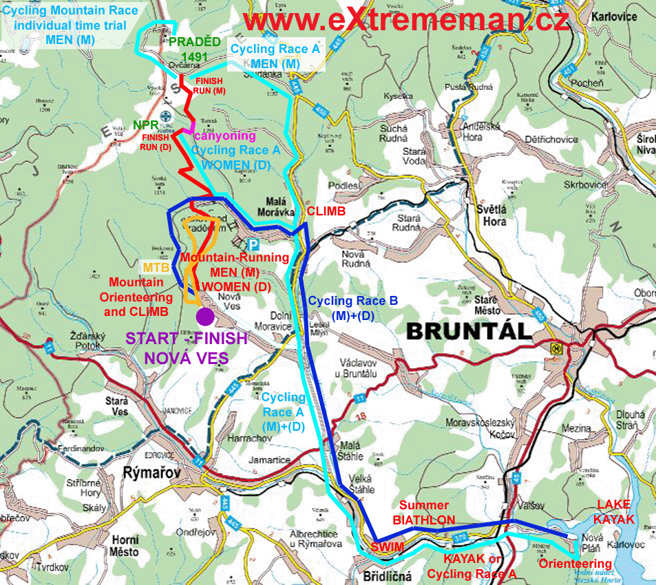 Pořadatel: Česká asociace extrémních sportů Technické provedení: SK SP Kylešovice Datum: sobota 17. června 2006 Shromaždiště: Nová Ves u Rýmařova - stadion běžeckých tratí Klasifikace závodu: Mistrovství ČR v extremním závodě jednotlivců Kategorie: Poznámka: Junioři mohou startovat v hlavní kategorii Muži Přihlášky a vklad: do 2. 6. 2006 - po terminu kontaktujte pořadatele e-mailem v přihlášce uveďte stejné údaje jako jsou požadovány v el. formuláři v přihlášce uveďte stejné údaje jako jsou požadovány v el. formuláři Vklad: na účet u eBanky, č.ú. 72972028/2400, Variabilní symbol: 200610, Specifický symbol: rodné číslo odesílatele Prezentace a výklad tratí: Výklad tratí a organizace závodu v 21:00 hod. pro všechny závodníky povinný! Informace: Start: v Nové Vsi u Rýmařova - stadion běžeckých tratí: Muži v 5:00 hod. Ženy v 5:30 hod. Cíl: v Nové Vsi u Rýmařova - stadion běžeckých tratí. Převoz materiálu: Pořadatel zajistí v pátek od 21:00 hod. převoz lodí na start disciplíny. Věci na silniční kolo a silniční kolo odevzdají závodníci 30 minut před startem. Věci na OB, kajak, lezení předají závodníci pořadatelům 0.30 hod před startem v sobotu ráno 17.6.2005. Ostatní doporučuje pořadatel řešit vlastním doprovodem. Občerstvení: základní občerstvení na trati - iont, tekutiny, jídlo (ovoce, sladkosti, polévky ...), sůl... zajištěno Omezení: startují pouze závodníci starší 16 let. Předpokádaný dojezd vítězů: do cíle 15:00 hod. Poslední závodníci by měli dokončit závod do 19.00 hod. Sportovní disciplíny 1. disciplína - běh do vrchu 2. disciplína - canyoning 3. disciplína - silniční kolo 4. disciplína - plavání 5. disciplína - letní biatlon 6. disciplína - kajak 7. disciplína - jezerní kajak 8. disciplína - orientační běh 9. disciplína - lezení, bouldering 10. disciplína - Horský OB 11. disciplína - MTB (M) Muži, Veteráni (M,MV): disciplíny v pořadí 1,2,3,4,5,(3),6,7,3,8,9,10,11 (D) Ženy, Junioři (Ž,ŽV,ŽJ,MJ): disciplíny v pořadí 1,11,3,4,5(3),6,7,3,8,9,10 1 První disciplína - běh: délka 16 km (M), ženy 11km (D). 99,8% po lesních cestách a pěšinách. Start 850 m.n.m. - cíl Ženy (D) 1140 m.n.m. (max. výška 1182 m.n.m.) a Muži (M) 1300 m.n.m. (max. výška 1400 m.n.m.) Druhá disciplína 2 - canyoning Muži, Veteráni: canyonig, délka 1,0 km. V průběhu první disciplíny běh. Délka se přičítá k délce běhu. 3A-1 Třetí disciplína - kolo Muži, Veteráni: Horská časovka, délka 3,6 km. Start 1300 m.n.m. - cíl 1491 m.n.m. (Praděd). Jedenáctá disciplína - MTB Ženy, Junioři: MTB sjezd, délka 4 km. Start 1150 m.n.m. - cíl 760 m.n.m. (Karlov p. Pradědem) 3A-2 Třetí disciplína - kolo Muži, Veteráni: silniční kolo, délka 30 km. Start 1491 m.n.m. - cíl 540 m.n.m. (Břidličná). Třetí disciplína - kolo Ženy, Junioři: silniční kolo, délka 20 km. Start 760 m.n.m. - cíl 540 m.n.m. (Břidličná). 4 Čtvrtá disciplína - plavání. Délka 1500m muži, veteráni a 800m ženy, junioři. Plavání proběhne v krytém bazénu v Břidličné. 5A Pátá disciplína - letní biatlon: Střelba na střelnici z malorážky (během sil. kola po plavání na střelnici za Břidličnou). 6 Šestá disciplína - sjezd řeky na kajaku. Délka 4km. Od střelnice po přehradu. Disciplína se uskuteční, pouze v případě, kdy bude průtok v řece Q [m3.s-1]: min. 3m3.s-1 (Náhradní varianta při nedostatku vody - přejezd na silničním kole do Nové Pláně na přehradu). 7 Sedmá disciplína - jezerní kajak. Délka 15 km (M) a 8km (D). Přehrada Slezská Harta UPOZORNĚNÍ: stavitel tratí připravil atraktivní překvapení v kombinaci s OB. 8 Osmá disciplína - orientační běh, Délka 7 km (M) a 4km (D) UPOZORNĚNÍ: stavitel tratí připravil atraktivní překvapení v kombinaci s jezerním kajakem. 3B Třetí disciplína - silniční kolo Muži i Ženy, Veteráni, Junioři druhá část: délka 34 km. 9 Devátá disciplína - lezení a bouldering v Malé Morávce během disciplíny silniční kolo. 10 Desátá disciplína - horský OB, Délka 5 km (M) a 3 km (D). Horský orientační běh není klasický OB, ale běží se podle turistické mapy. - lezení a bouldering. V průběhu HOB. 5B Pátá disciplína - letní biatlon, případné trestné okruhy ze střelby a lezení. CÍL kategorie Ženy (D). 11 Jedenáctá disciplína - MTB Muži, Veteráni: Délka 14 km. Cross Country. Nová Ves - Karlov - Nová Ves. CÍL kategorie Muži (M). Upozornění: - závodníci při disciplíně sjezd divoké řeky a jezerní kajak mají povinnost startovat s přilbou a vestou - závodníci na horských kolech mají povinnost startovat s přilbou Zdravotní zajištění: na startu, v cíli a operativní pořadatelské hlídky na trati Ceny: - první 3 závodníci v každé kategorii obdrží poháry, medaile a diplomy, první získají titul Mistr ČR a všichni závodníci dostanou věcnou cenu Ubytování: Vyhlášení a společ. večer: 18:00 - běžecký stadion v Nové Vsi Pořadatel zajistí občerstvení na spol. večeru pouze závodníkům, kteří potvrdí předem svou účast !!! |